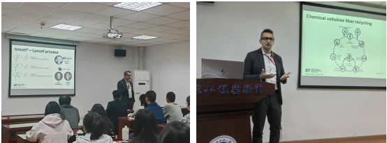Michael Hummel教授分享了纺织业“高性能”和“绿色化”前沿研究,涵盖纤维素溶解机理、再生纤维制备、纺丝参数优化,到循环回收的基础研究和产业化应用。Michael Hummel教授围绕高性能纤维素纤维制备与纺织工业绿色转型中的创新应用,以木材等纤维素原料通过离子液法直接溶解制备纤维的可持续工艺入题,讲解了从浆粕制备、研磨溶解、纺丝成纤的全流程,阐释了“空气间隙纺丝”和拉伸取向机制——通过应力诱导纤维素分子排列,形成高强纤维,为大家在再生纤维素纤维领域的研究提供了新的启发,对废纺回收再利用前沿研究提供了国际视野,让同学们受益匪浅。