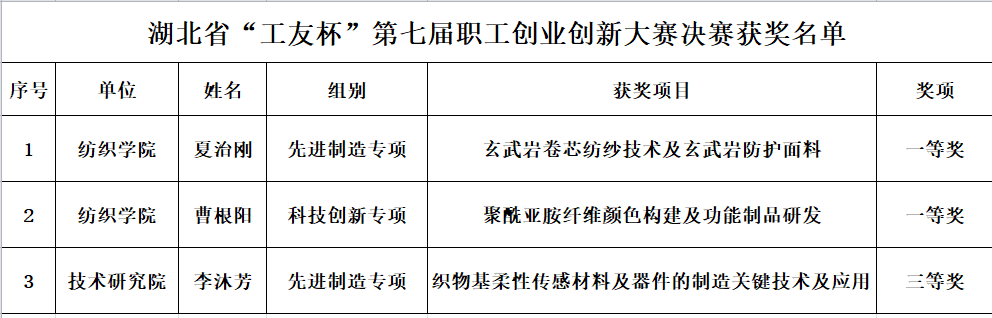 11月26日上午,从湖北省“工友杯”第七届职工创业创新大赛颁奖典礼现场传来喜讯,技术研究院纺织纤维及制品教育部重点实验室李沐芳教授表现卓越,在先进制造专项中荣获三等奖。