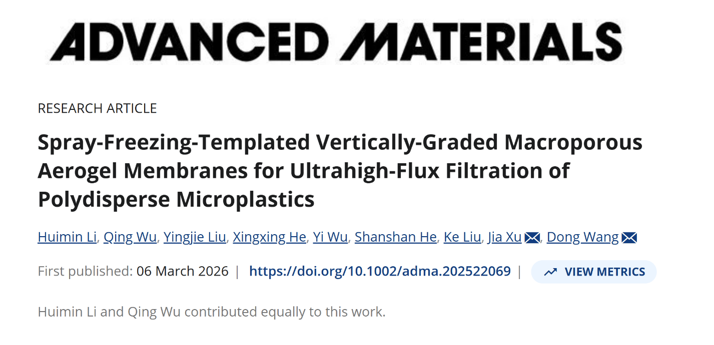 近日,技术研究院纺织纤维及制品教育部重点实验室(实验室网站: https://fzxwzp.wtu.edu.cn/)王栋教授团队青年教师徐佳博士在国际知名学术期刊 Advanced Materials 上发表题为“Spray-Freezing-Templated Vertically Graded Macroporous Aerogel Membranes for Ultrahigh-Flux Filtration of Polydisperse Microplastics” 的高水平研究论文。武汉纺织大学为论文第一署名单位,硕士研究生李慧敏和吴青为论文共同一作,王栋教授和青年教师徐佳博士为共同通讯作者。