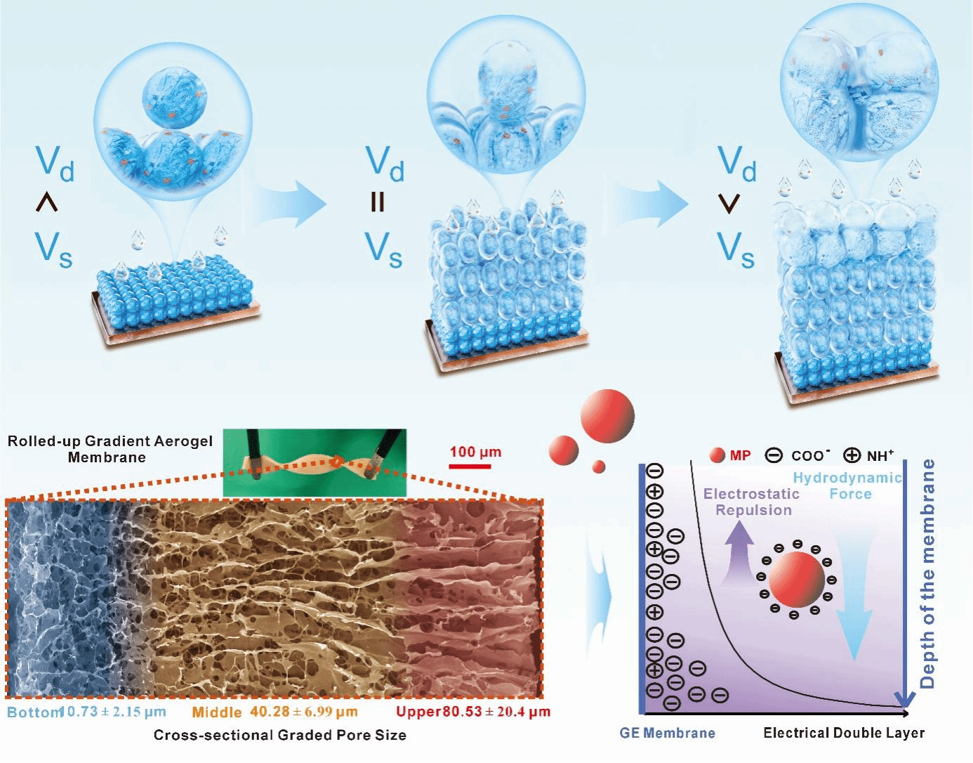 微塑料污染已渗透到海洋、淡水和陆地生态系统,其粒径跨度大(亚微米至毫米级),对传统过滤膜提出了严峻挑战。传统膜材料往往面临“选择性-渗透性”权衡难题,且多步制备工艺复杂、重复性差,难以应对复杂水体环境中的多尺寸分散微塑料。针对这一瓶颈,研究团队开发了一种基于温度梯度控制的一步喷雾冷冻技术。通过协同调控基底温度(-50°C至0°C)、悬浮液流速和喷头距离,精确匹配冷凝前沿速度与液滴积累动力学,成功制备出具有无缝梯度孔径结构的垂直梯度气凝胶(GE)膜。该膜孔径从顶层的约100 μm连续减小到底层的约3 μm,并含有低至0.2 μm的限制性孔喉。